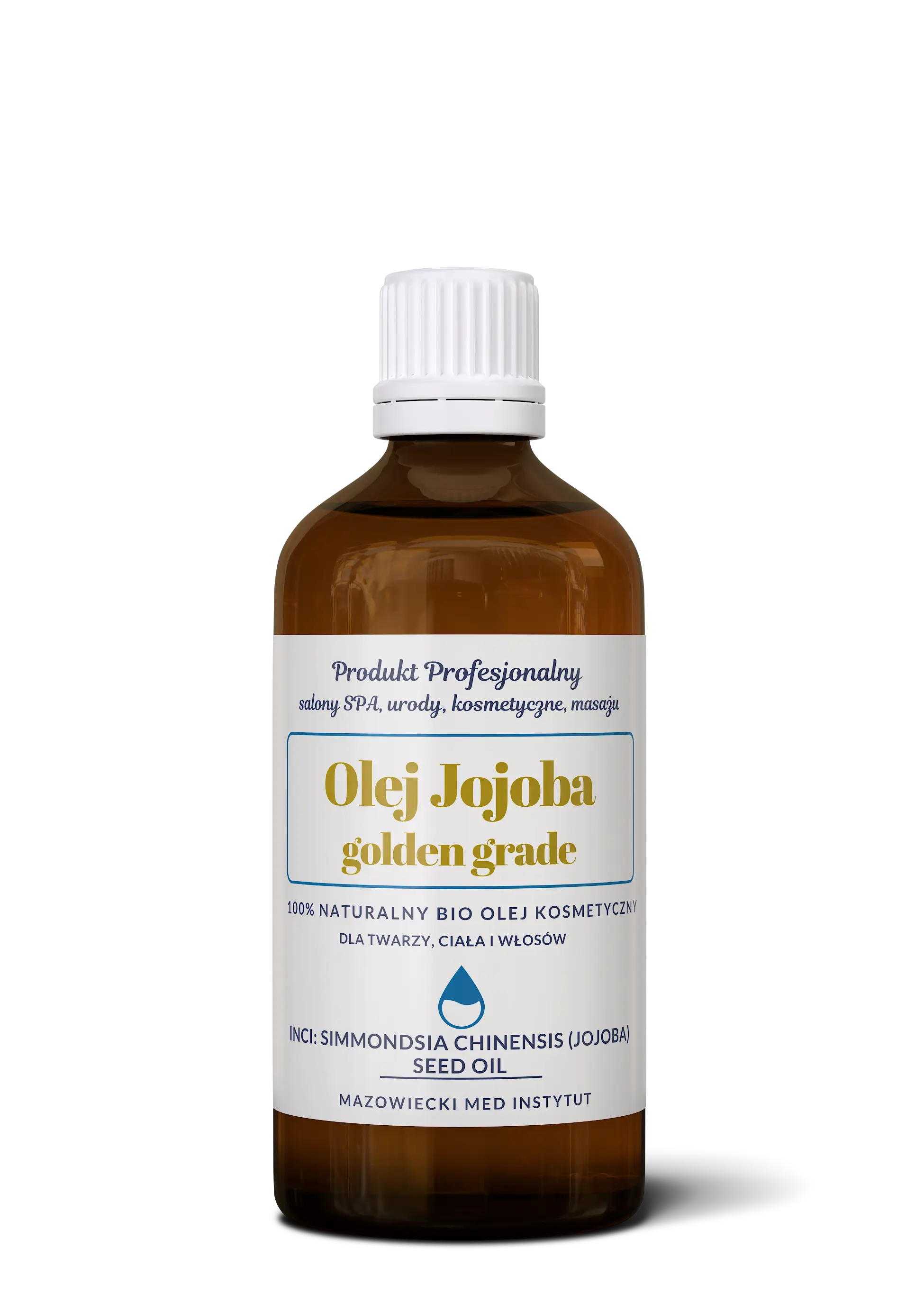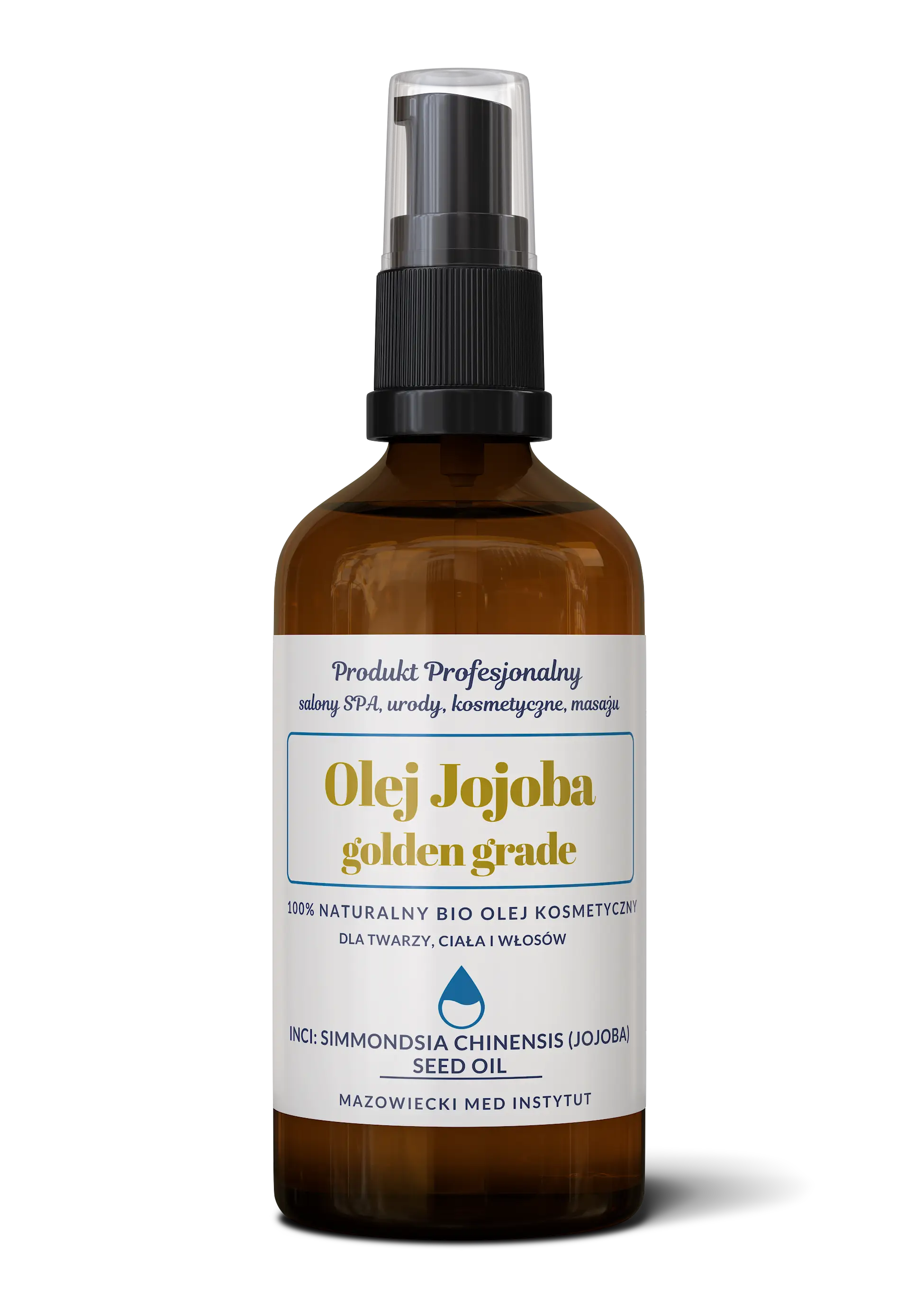 100% naturalny, tłoczony na zimno, nierafinowany olej złotej klasy Golden Grade Jojoba 100 ml w szklanej butelce z wygodną pompką. W sprzedaży tylko w dobrych salonach kosmetycznych i SPA.