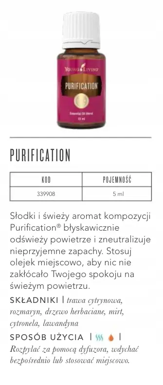 Purification™ - Jest to antybakteryjna i odkażająca kompozycja stworzona do rozpylania i stosowania bezpośrednio na skórę . Pomaga oczyścić dom, w którym mieszkamy i środowisko, miejsce w którym pracujemy. Wspaniale czyści powietrze i neutralizuje pleśń, dym papierosowy i nieprzyjemne zapachy. Stosowana bezpośrednio na skórę mieszanka ta doskonale może być wykorzystana aby oczyścić rozcięcia skóry, wszelkie rany cięte i zadrapania. Znakomicie pomaga neutralizować trujące ukąszenia pająków, pszczół, szerszeni i os.
