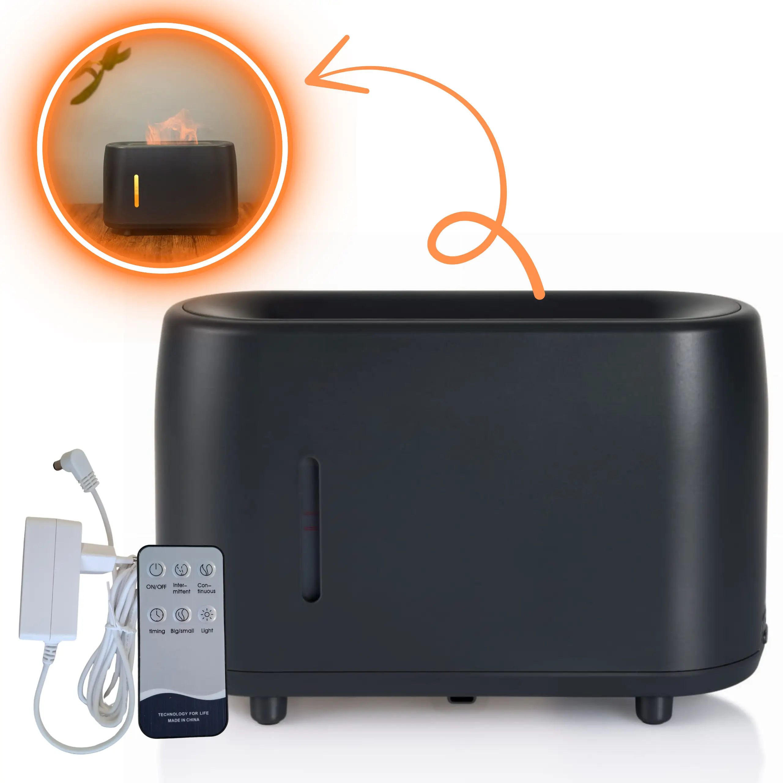 AROMA FLAME jest specjalnie stworzony do tego by dodawać do wody wszystkie olejki eteryczne(także cytrusowe), co jest niedozwolone w 93 % sprzedawanych nawilżaczy powietrza. Tę możliwość daje zastosowanie żywicy ABS w połączeniu z polipropylenem zamiast zwykłego plastiku.