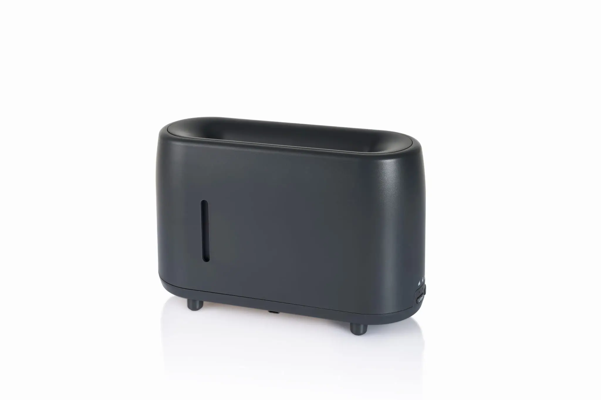 Dyfuzor w kolorze ciemnoszarym, którrgo mgiełka imituje płomień - dedykowany do zabiegów aromaterapii i nawilżania pomieszczeń. Świetny do minimalistycznych wnętrz oraz biur!